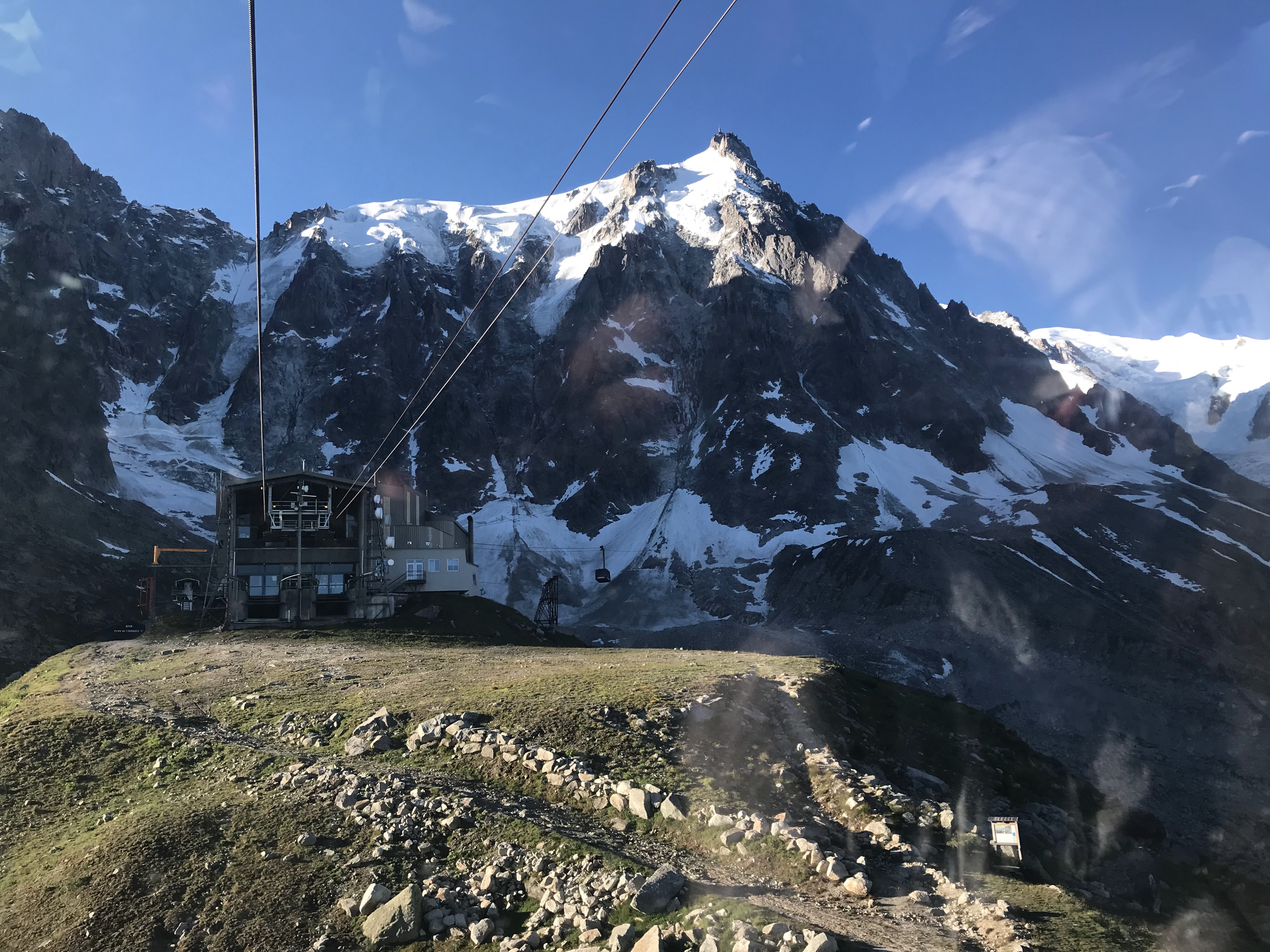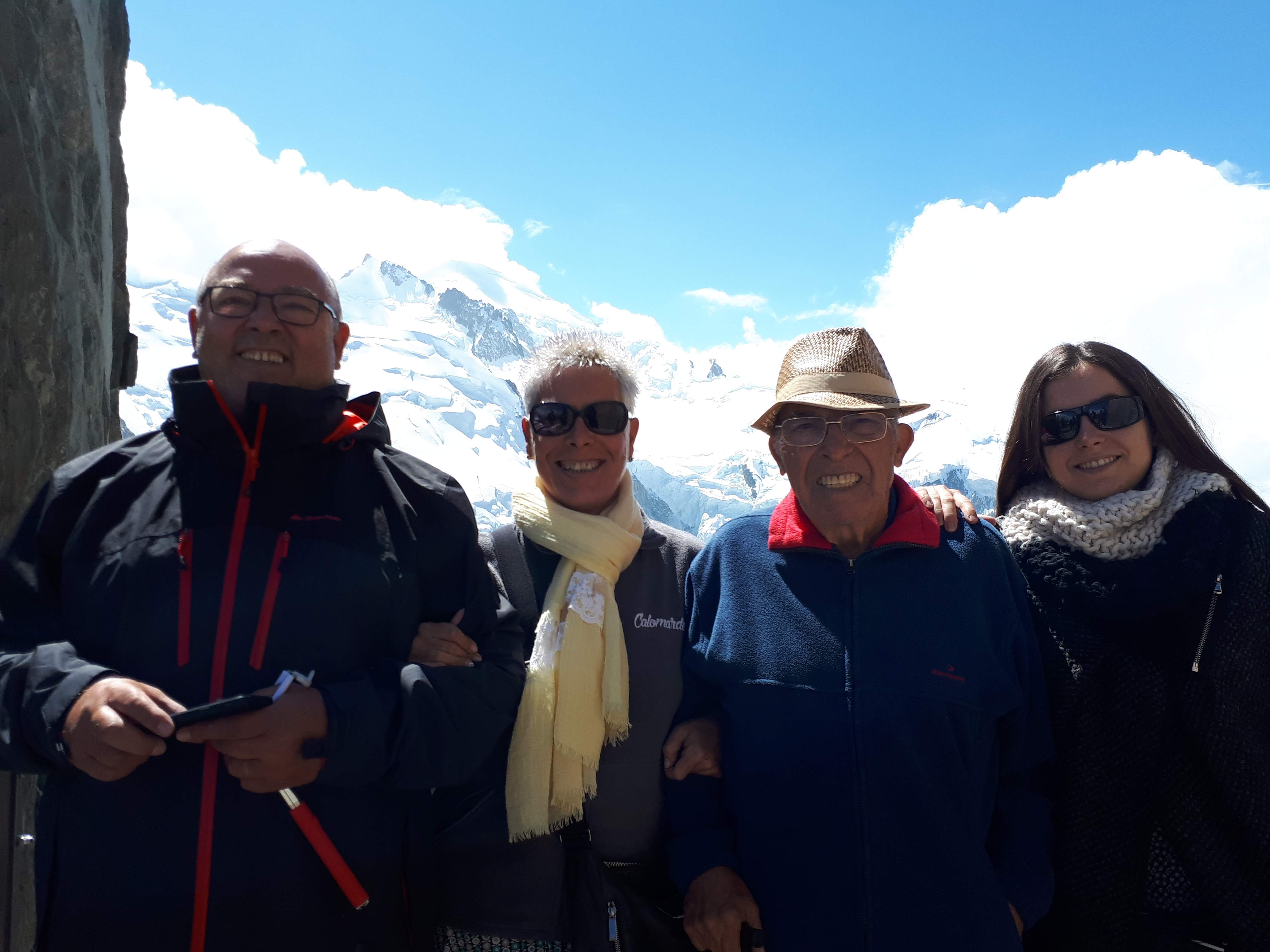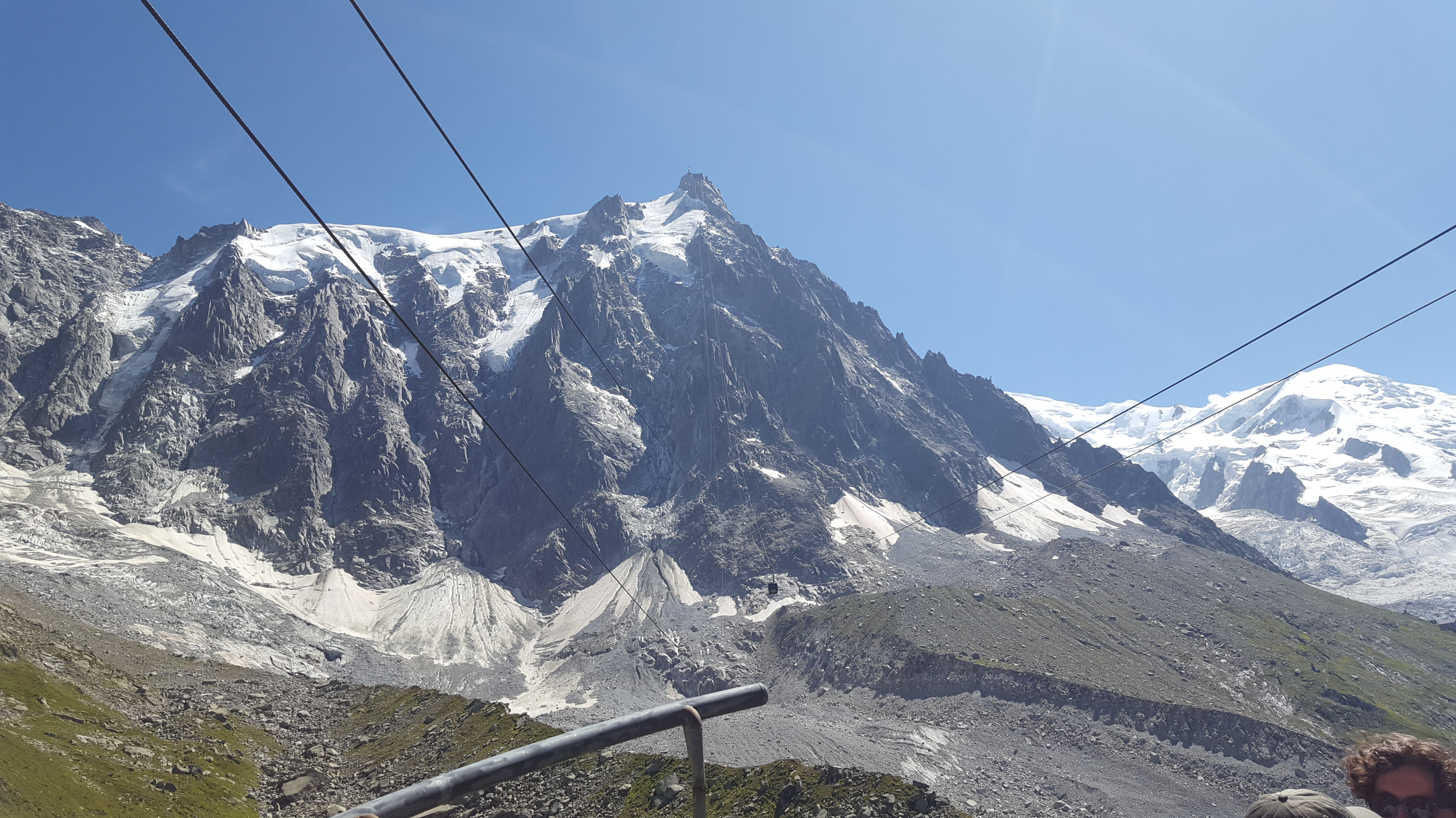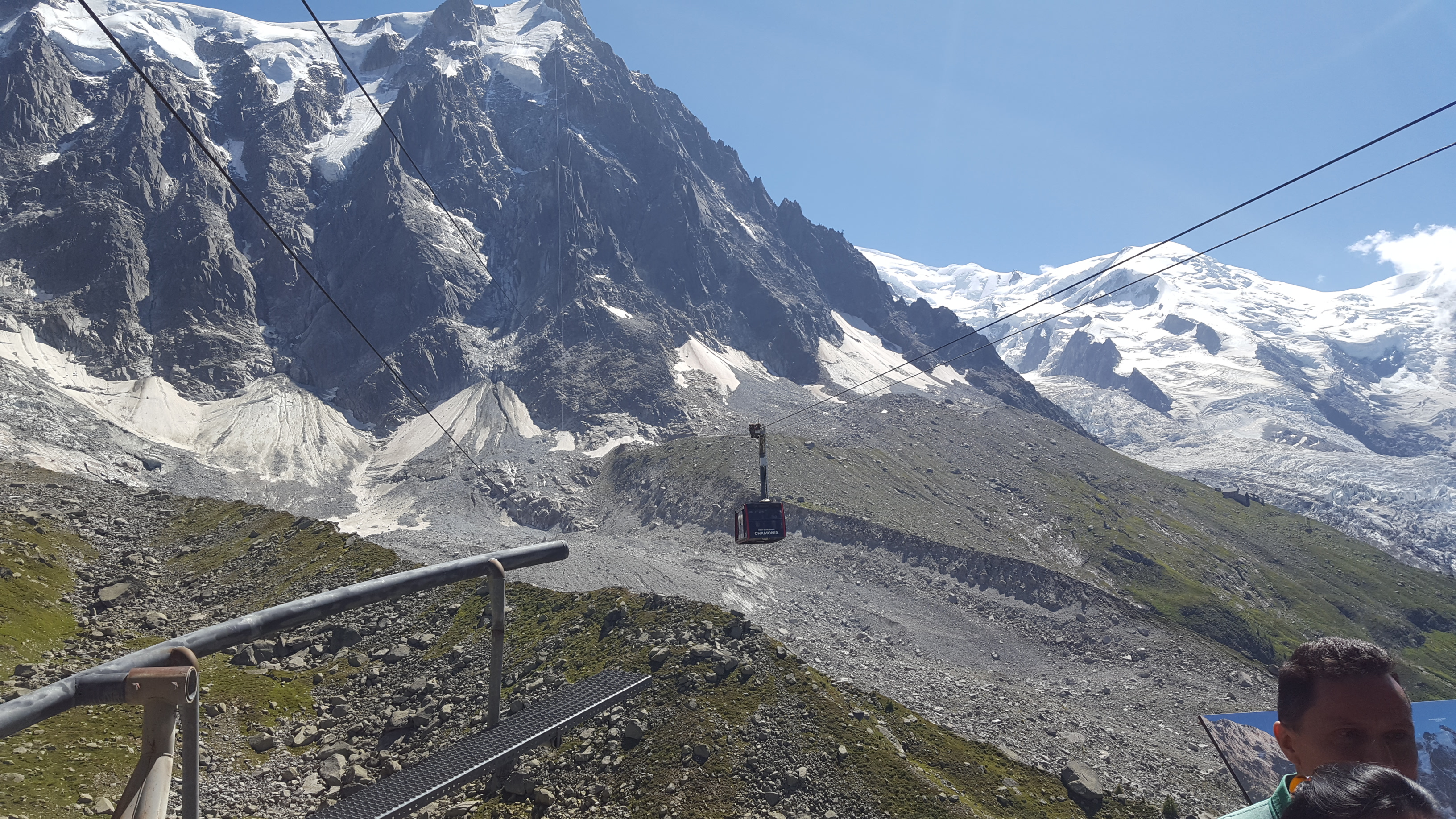 Nous montons à bord du téléphérique qui, après avoir payé 61,50 €/personne, nous emmène au Plan de l'Aiguille (2317 m) en dix minutes. Nous continuons la visite dans une deuxième télécabine, sur le glacier des Bossons, jusqu'à atteindre en dix minutes supplémentaires la base de deux sommets pointus, où se trouve une plate-forme à 3777 m offrant une vue à 360º sur les Alpes françaises, suisses et italiennes. Indescriptible.