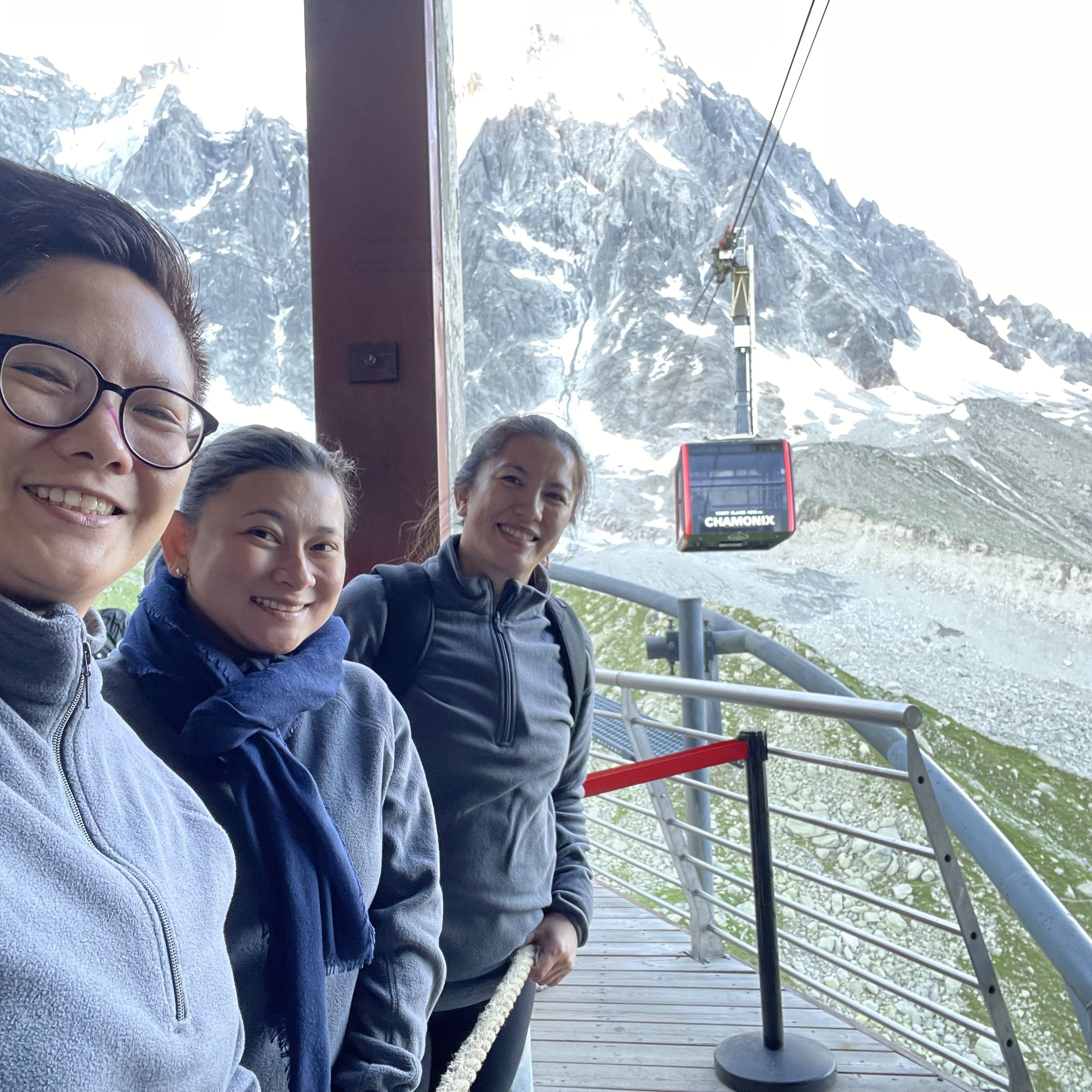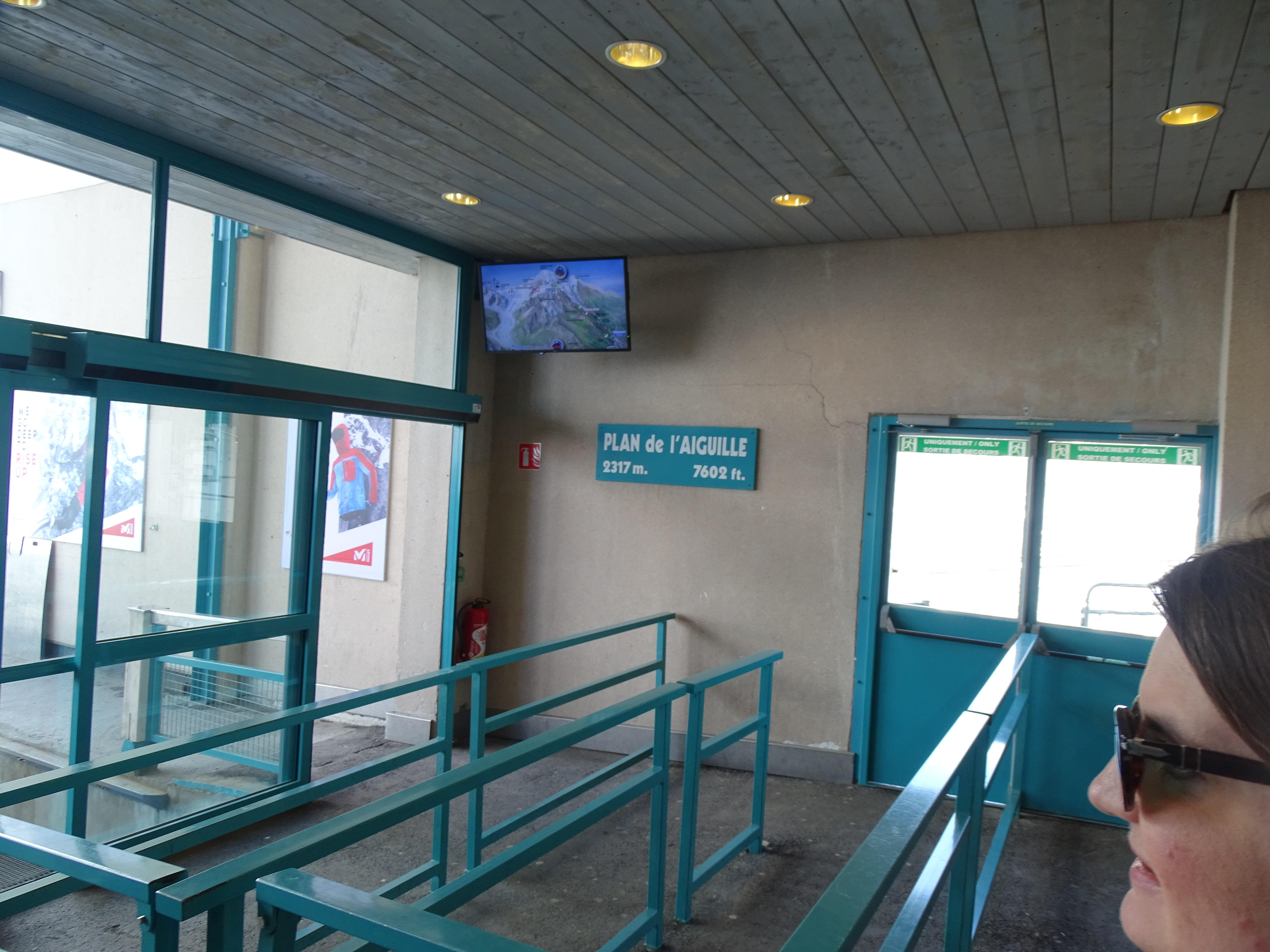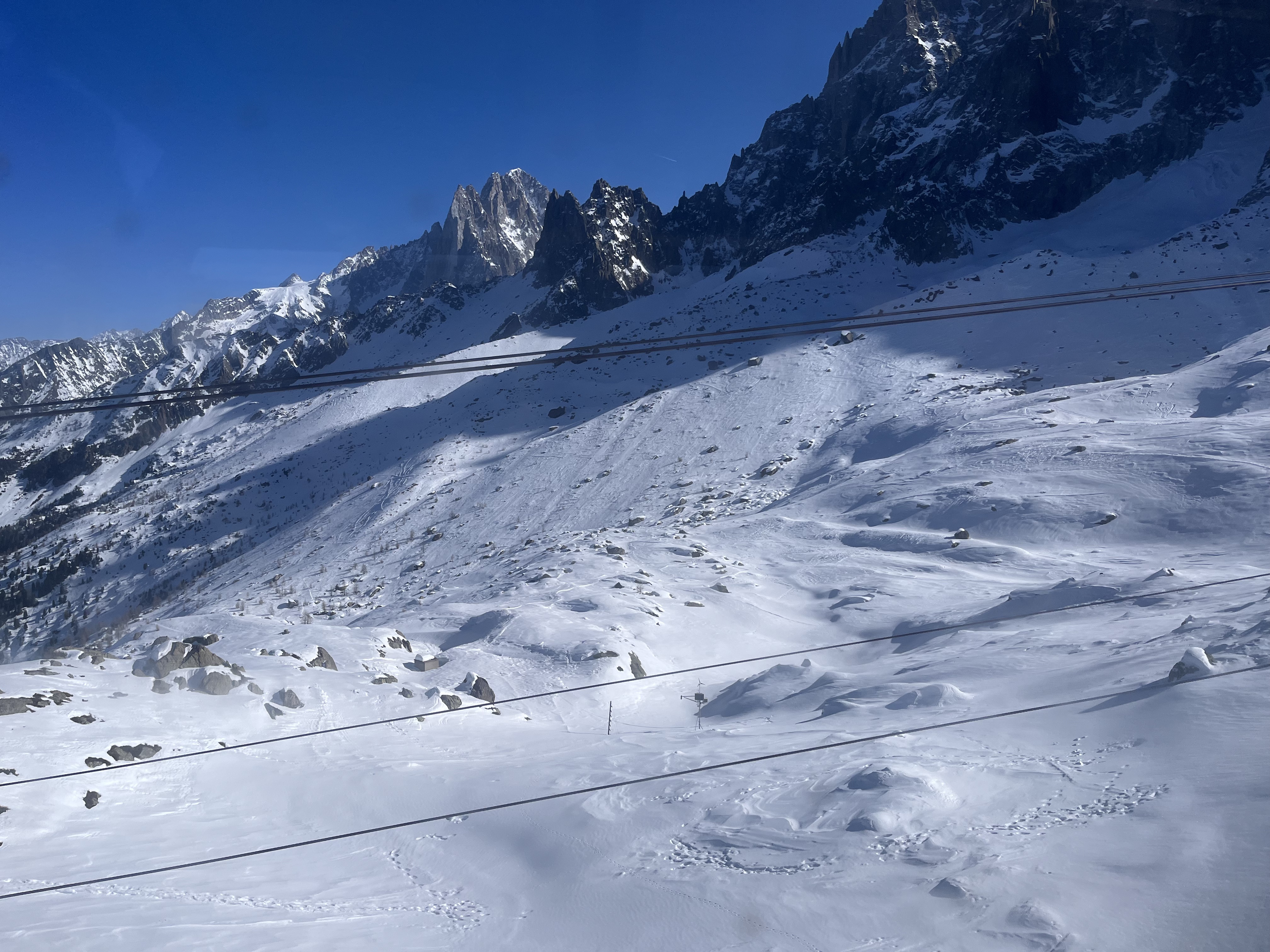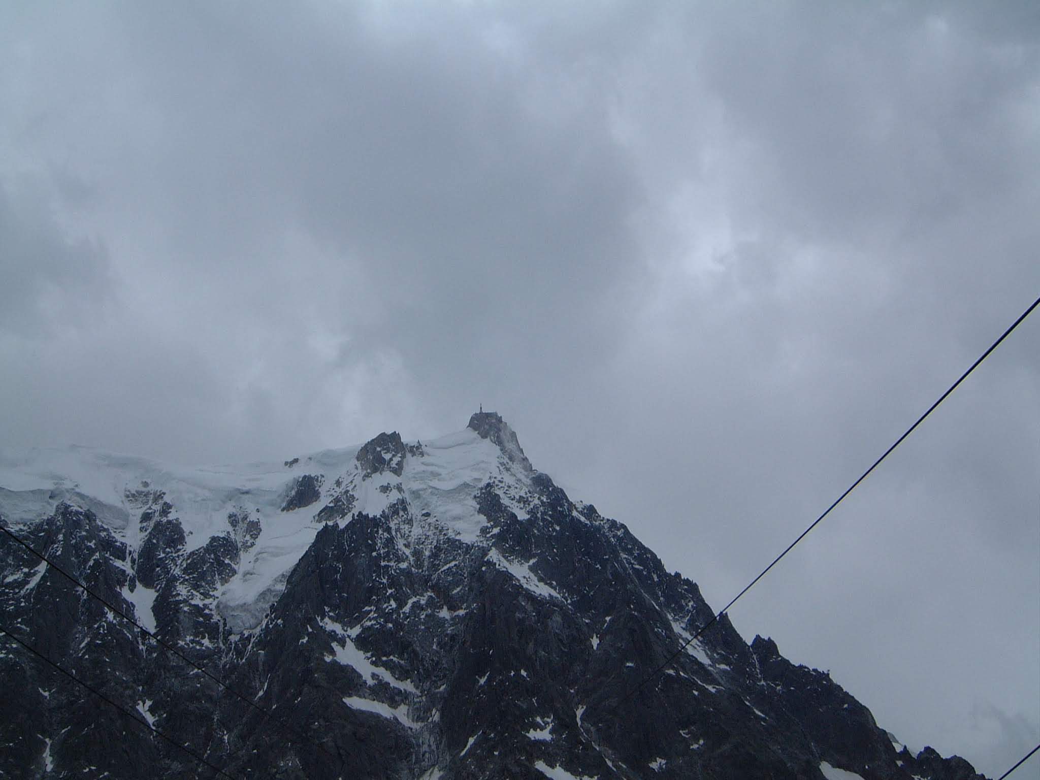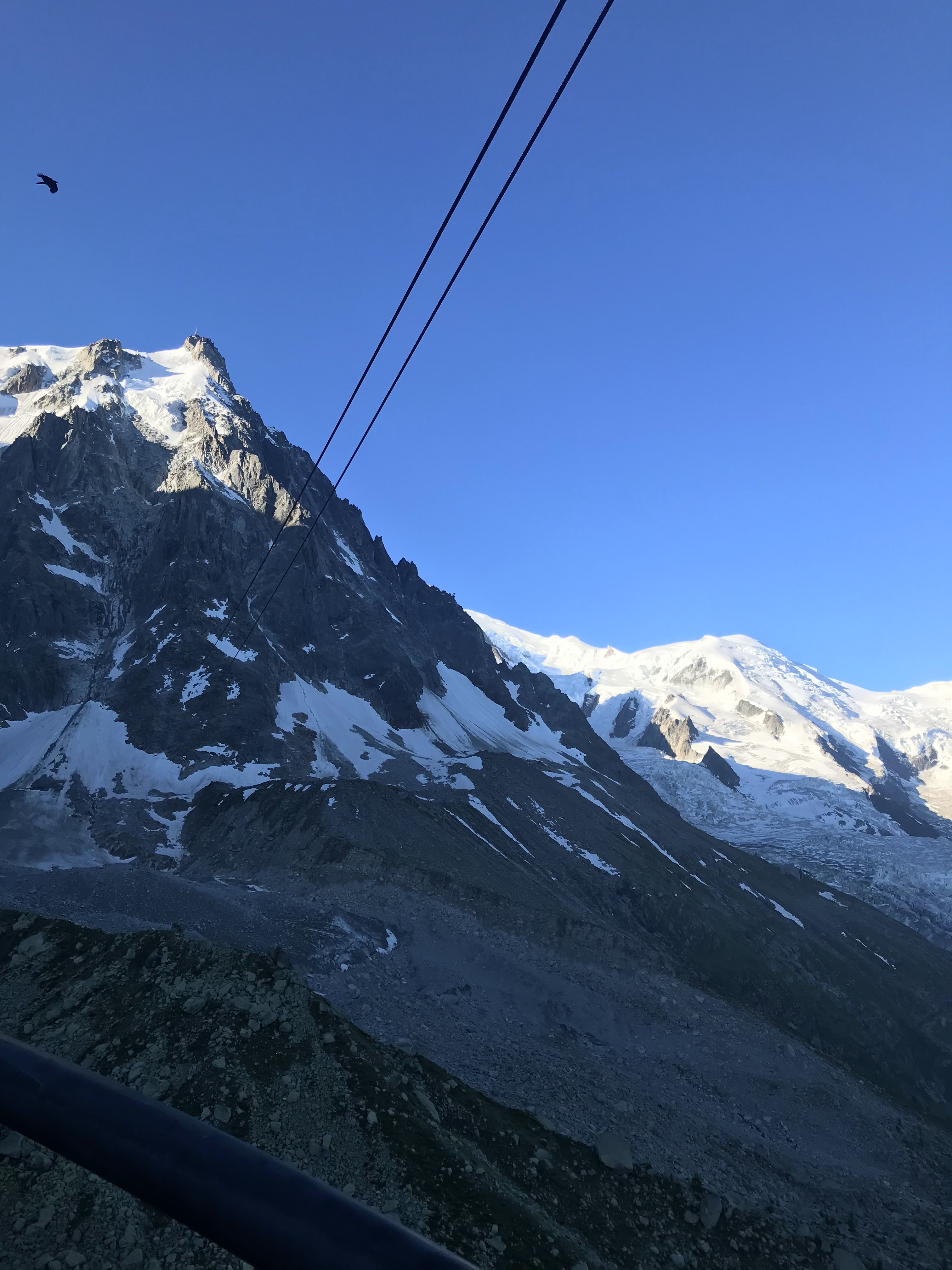 Nous montons à bord du téléphérique qui, après avoir payé 61,50 €/personne, nous emmène au Plan de l'Aiguille (2317 m) en dix minutes. Nous continuons la visite dans une deuxième télécabine, sur le glacier des Bossons, jusqu'à atteindre en dix minutes supplémentaires la base de deux sommets pointus, où se trouve une plate-forme à 3777 m offrant une vue à 360º sur les Alpes françaises, suisses et italiennes. Indescriptible.