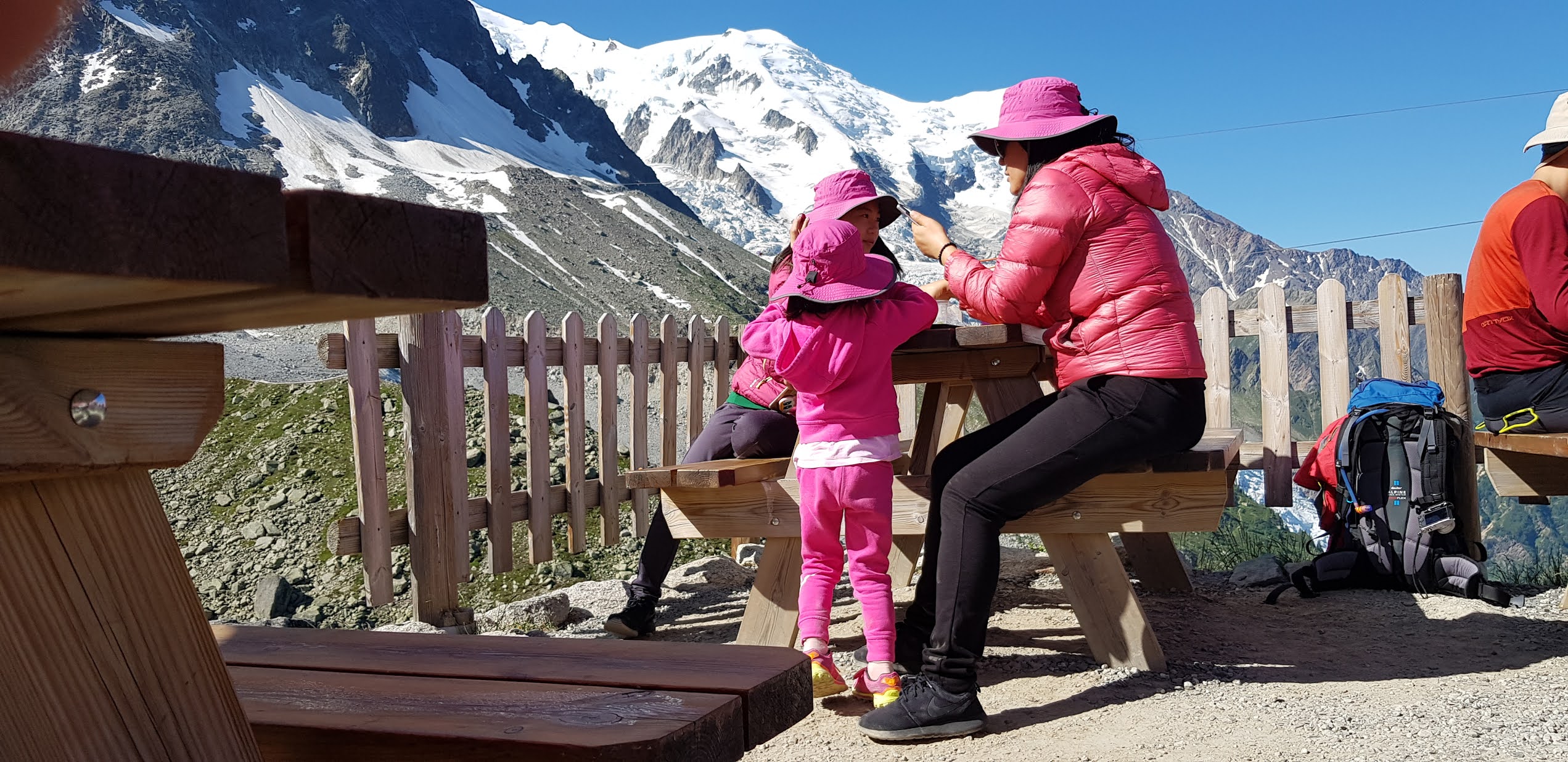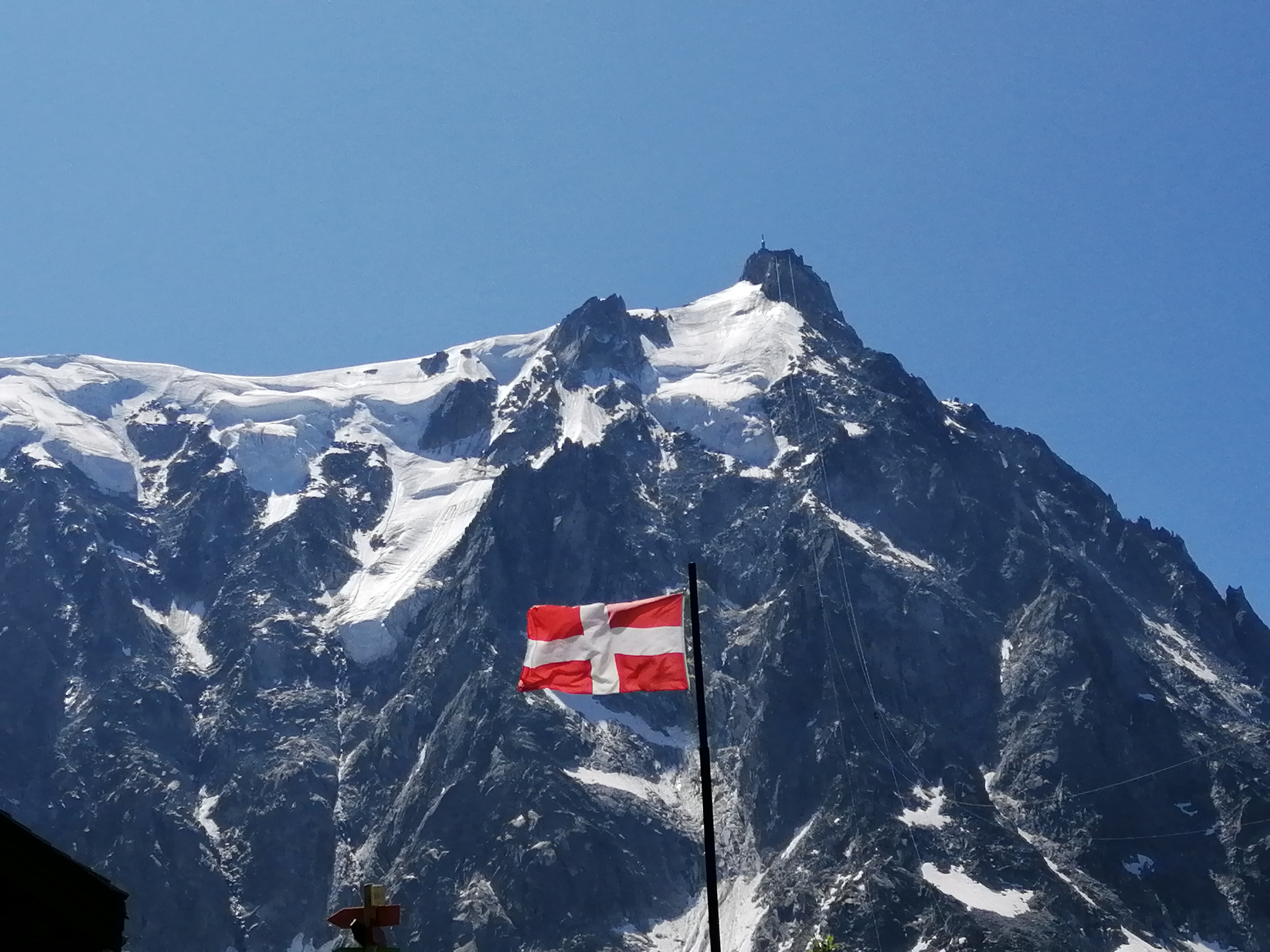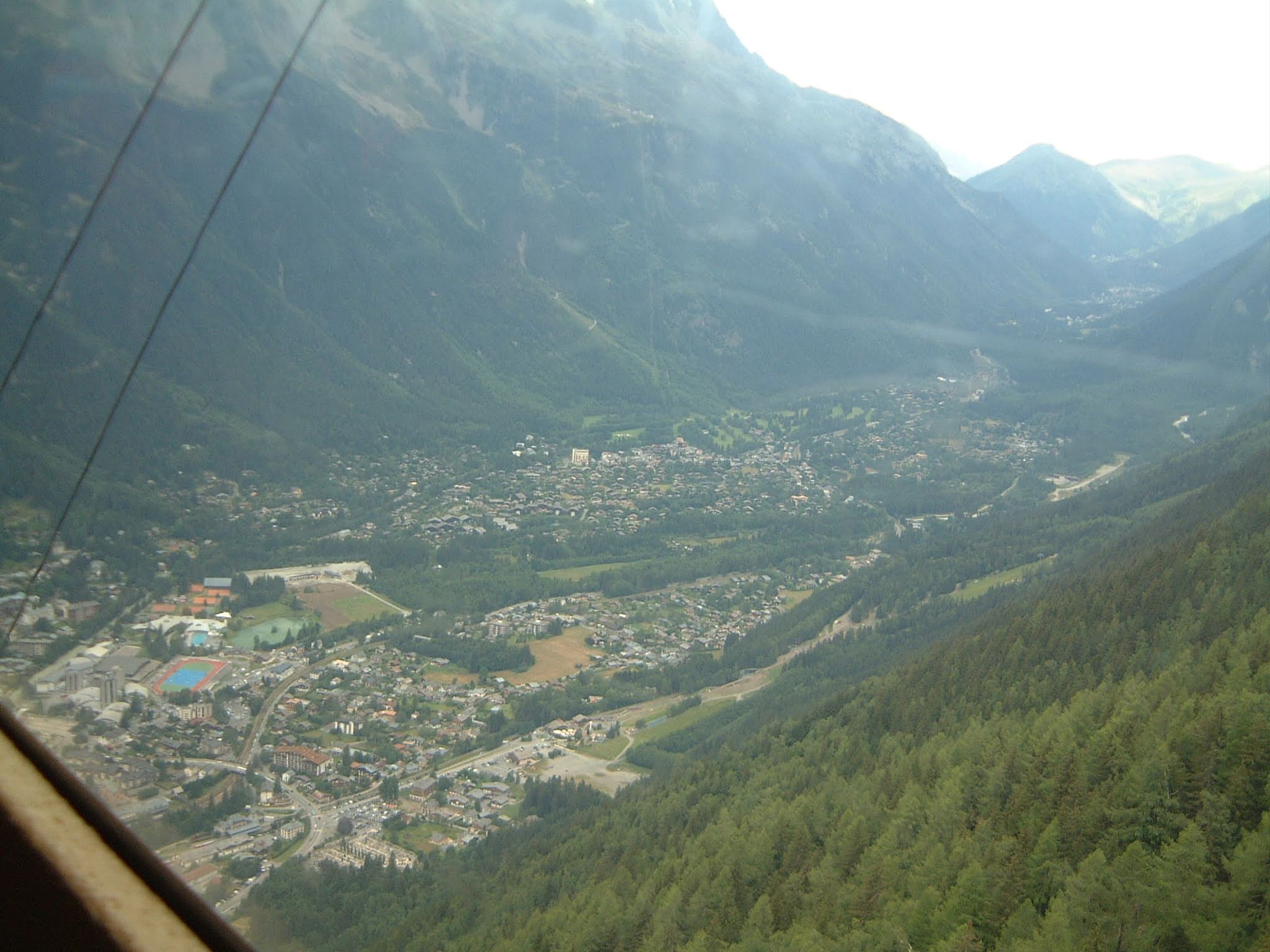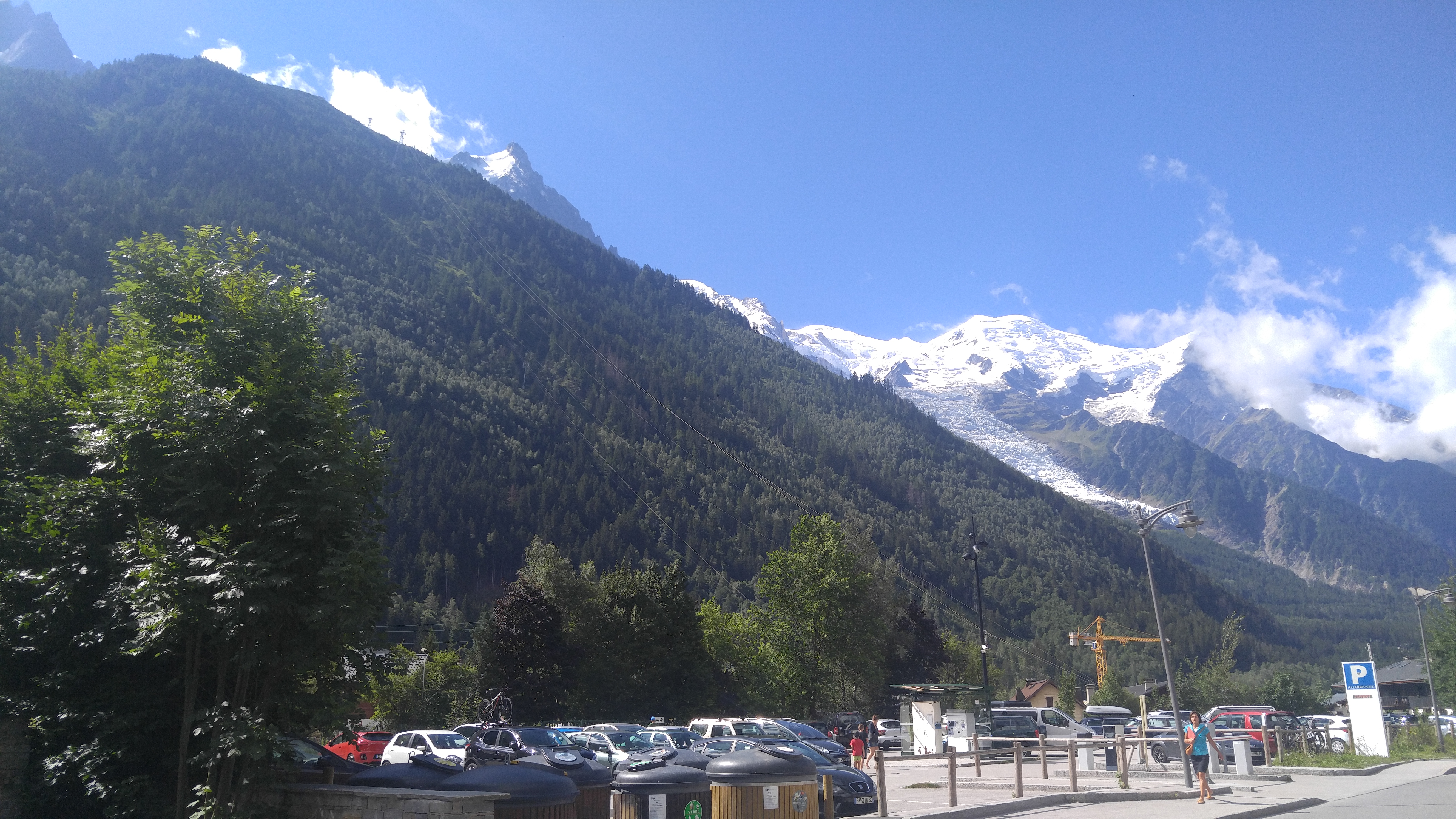 Nous montons à bord du téléphérique qui, après avoir payé 61,50 €/personne, nous emmène au Plan de l'Aiguille (2317 m) en dix minutes. Nous continuons la visite dans une deuxième télécabine, sur le glacier des Bossons, jusqu'à atteindre en dix minutes supplémentaires la base de deux sommets pointus, où se trouve une plate-forme à 3777 m offrant une vue à 360º sur les Alpes françaises, suisses et italiennes. Indescriptible.