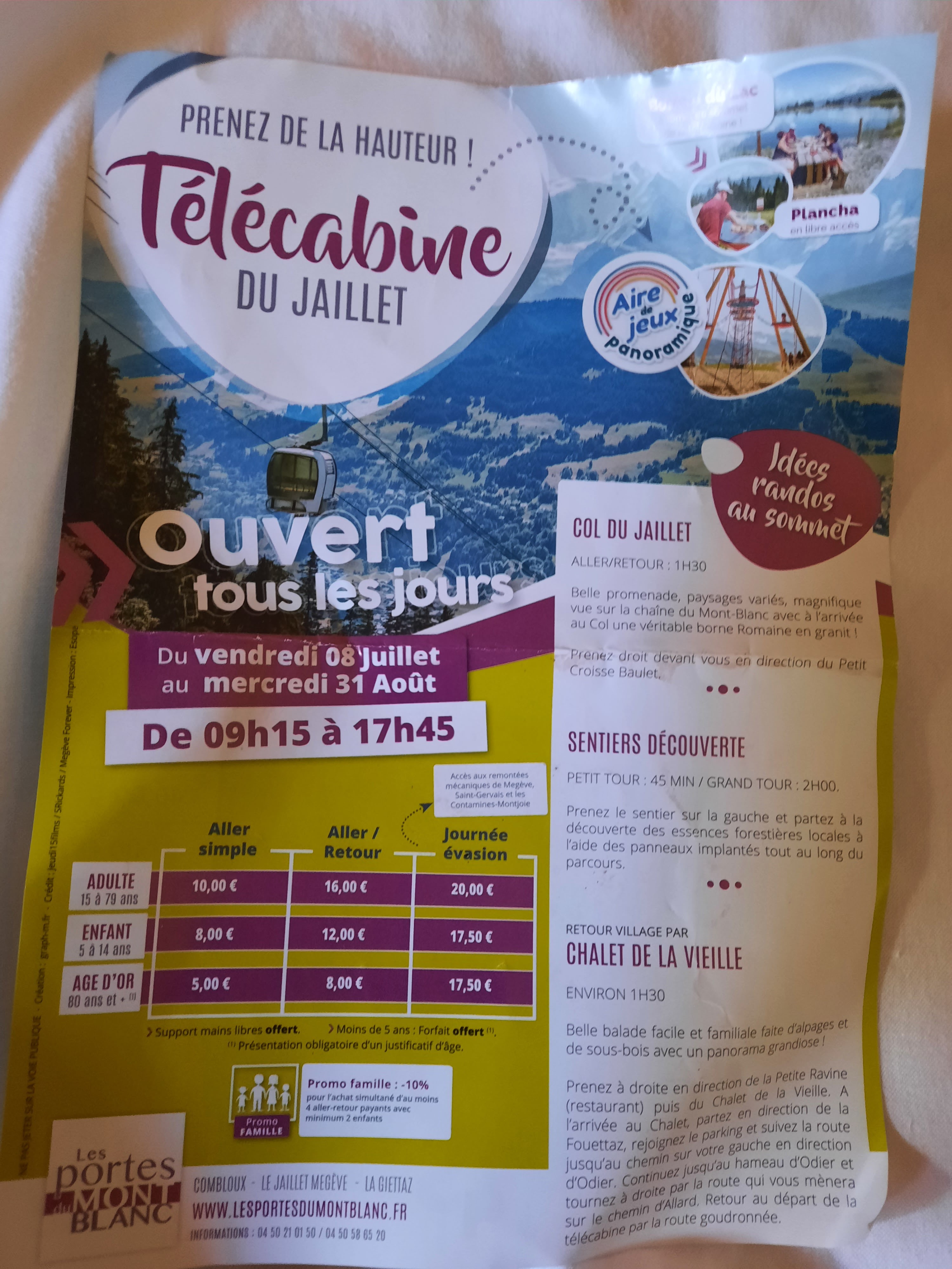 Famille avec 2 enfants en bas age nous avons choisi un aller retour, 16e par adulte soit 32e un peu cher. En haut très belle vue, air de jeux pour enfant (gratuite.. enfin vu le prix de l'aller retour, ils peuvent...), plusieurs panneau pour afficher les randonnées possible, un foodtruck qui propose des glaces. Peu d'ombre sur place. En bas personnel très agréable, en haut nous avons eu des difficultés avec notre poussette personne n'a lever le petit doigts