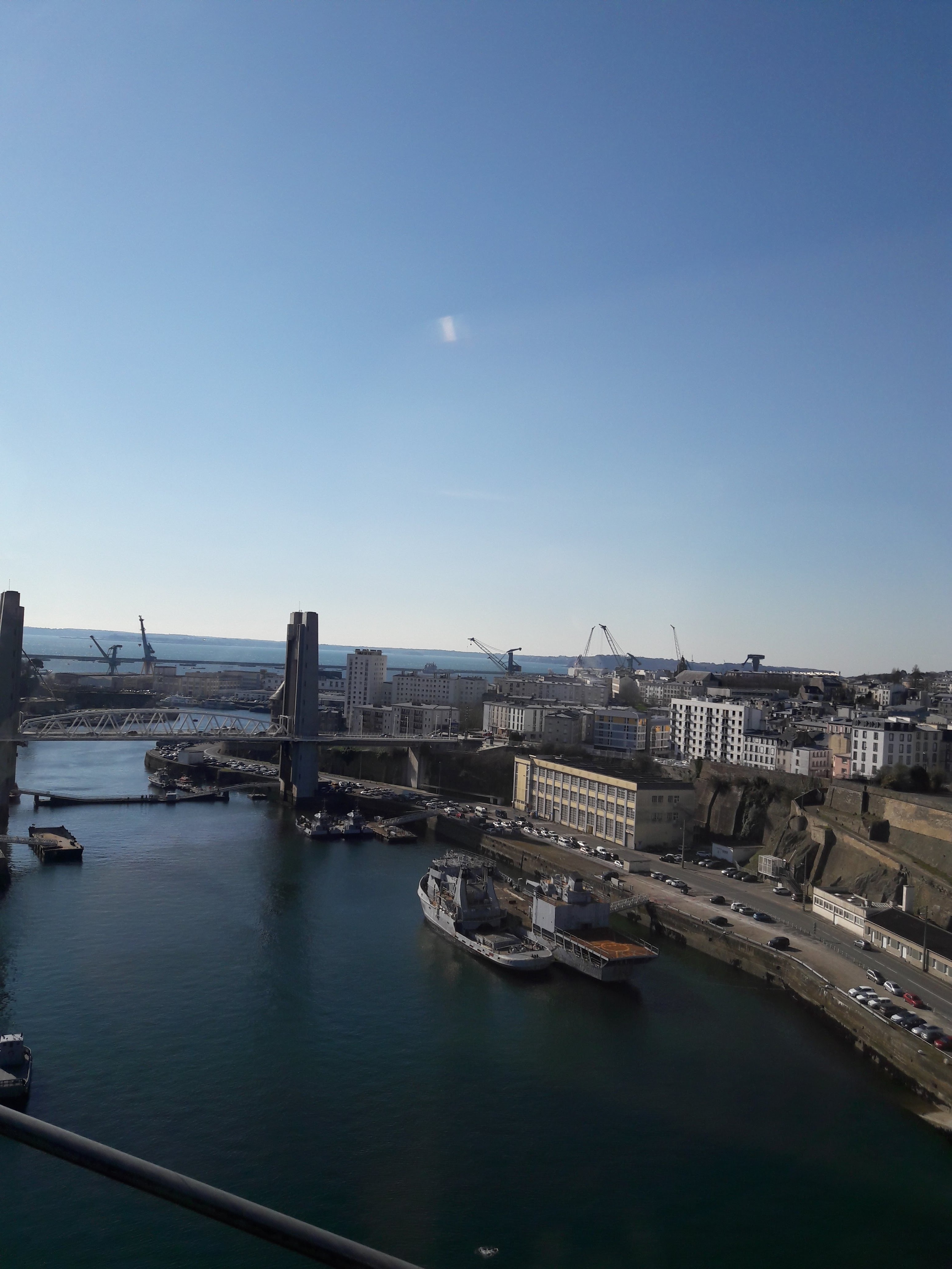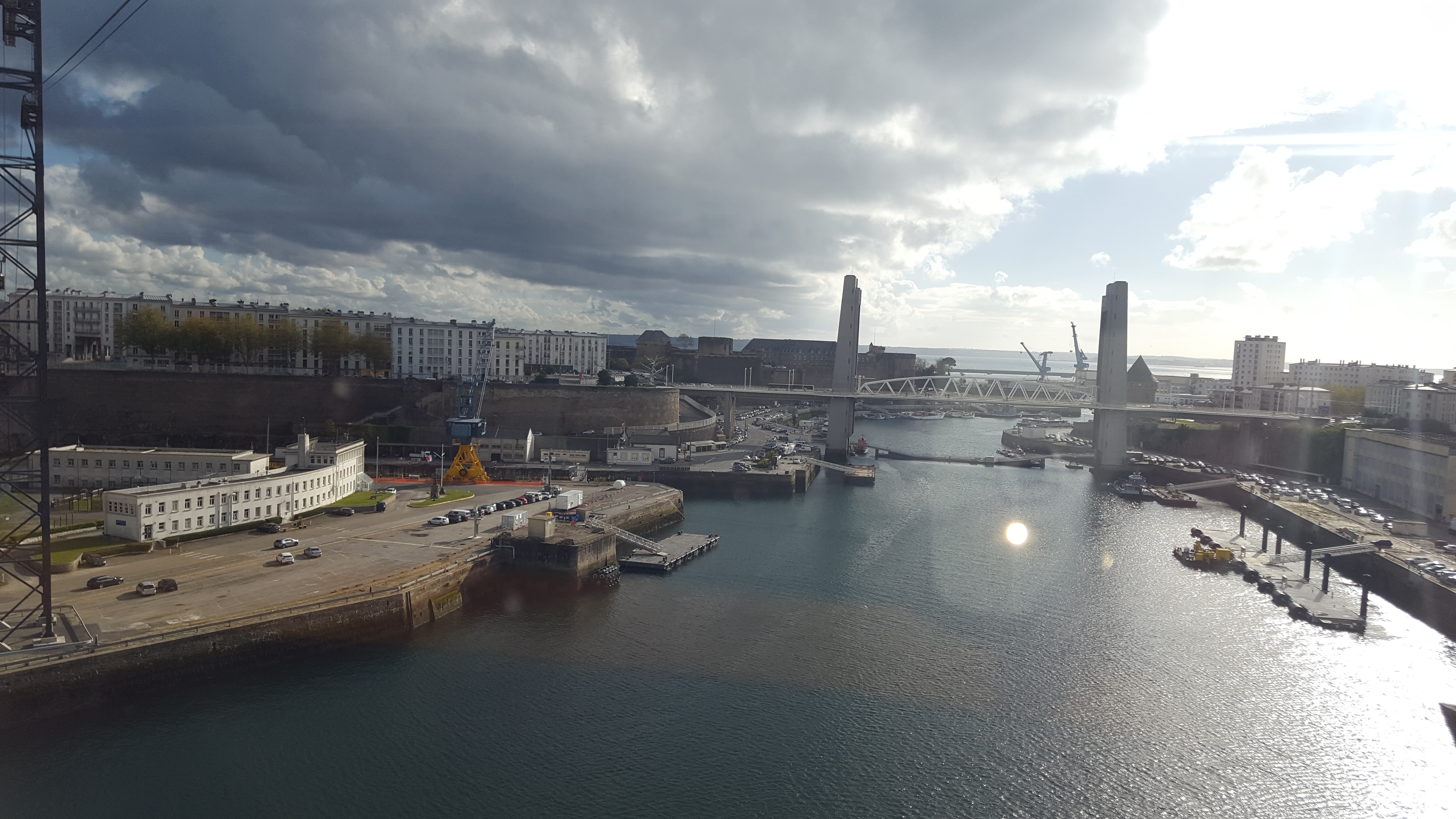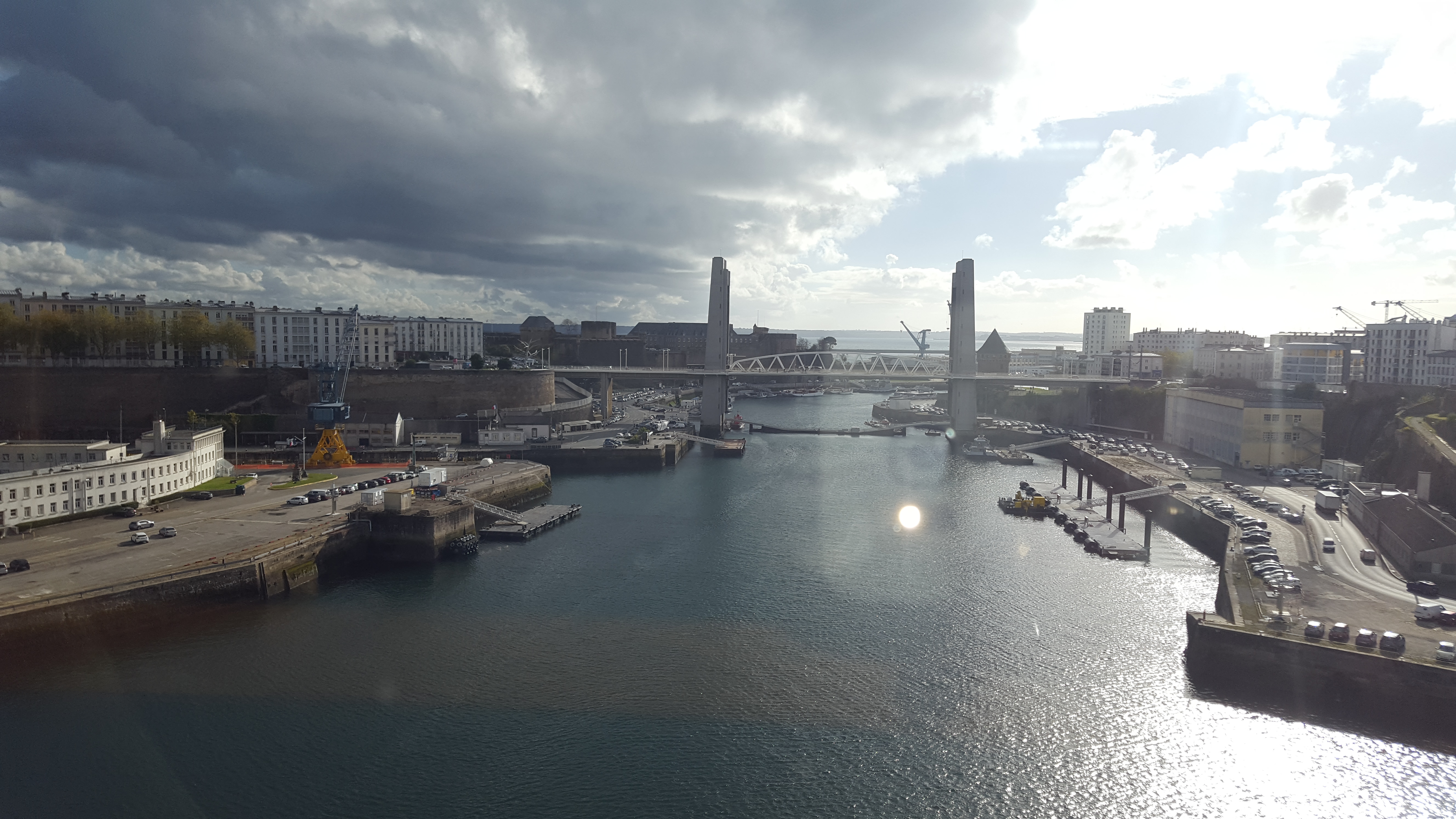 Belle vue sur les chantiers navals et le pont de Recouvrance. Téléphérique toujours en rade à Brest. C'est très dommage.