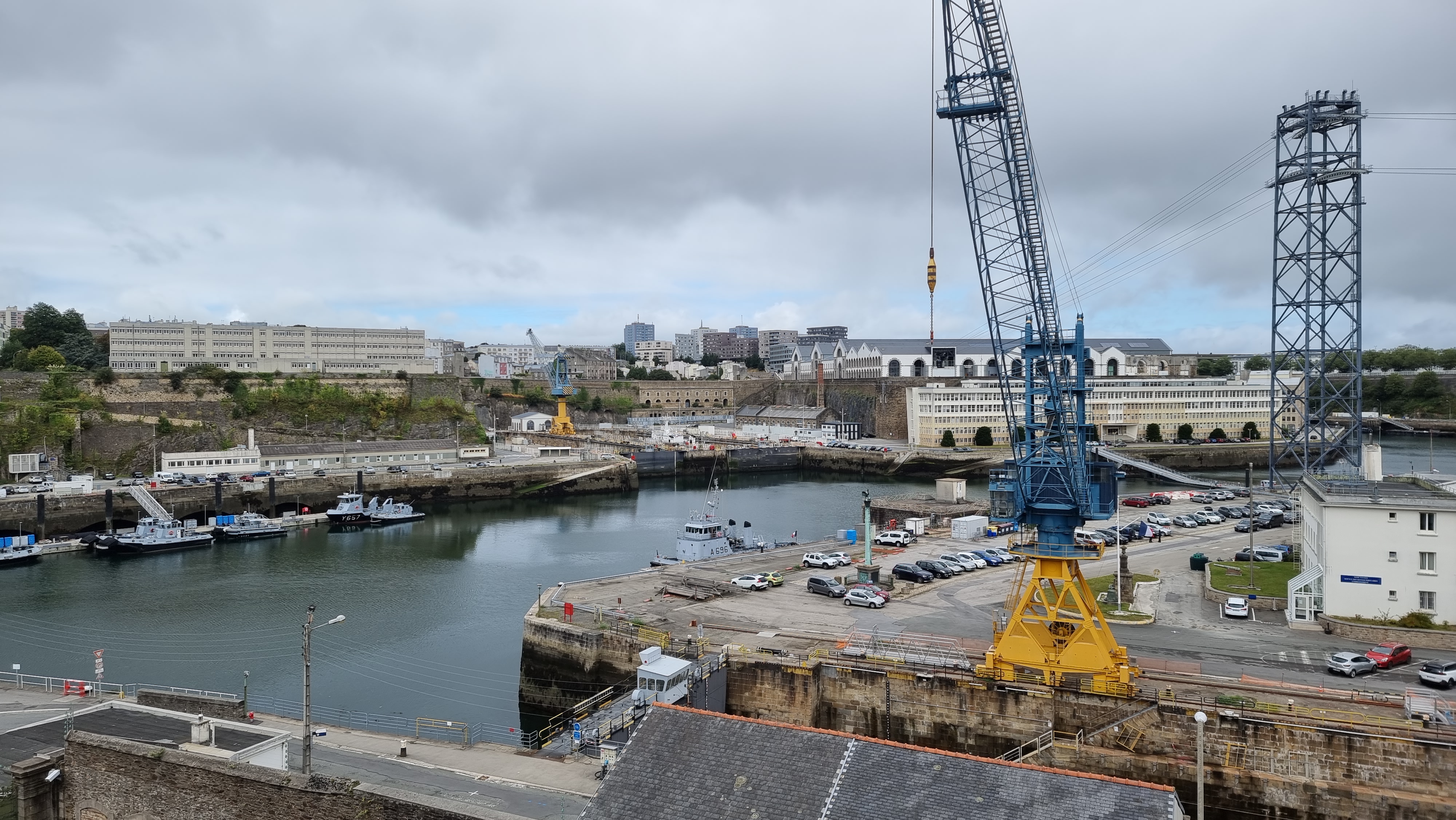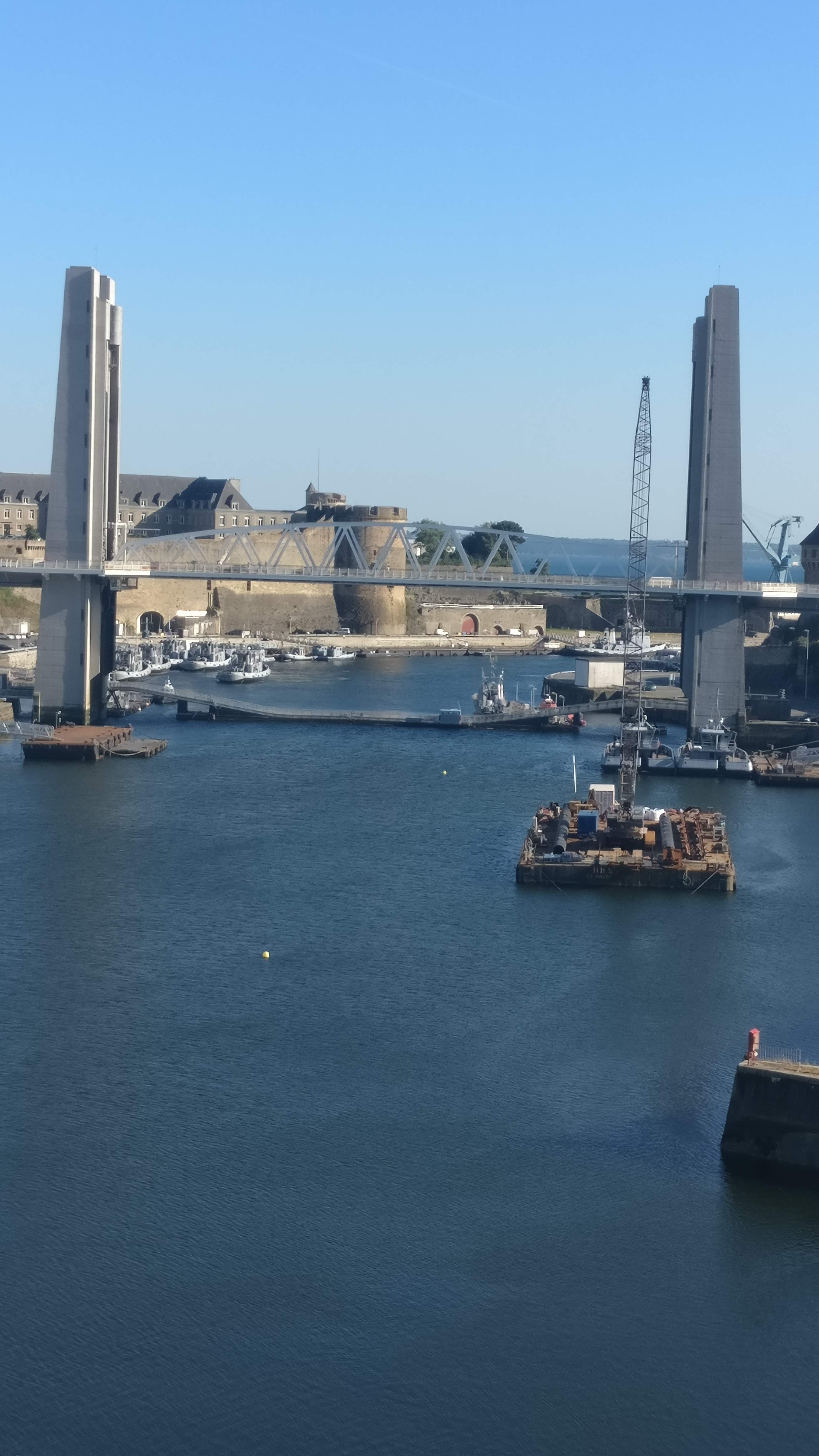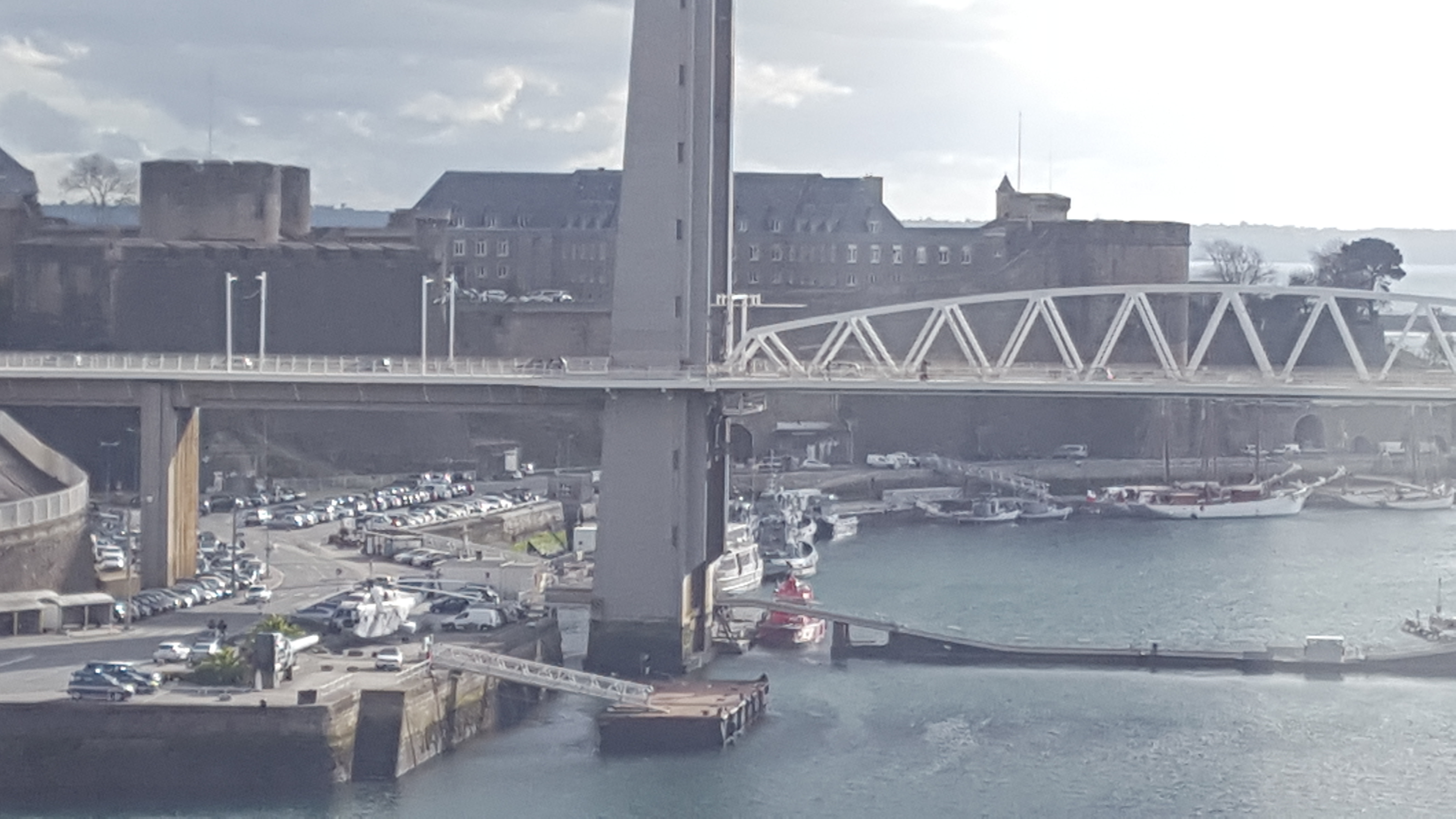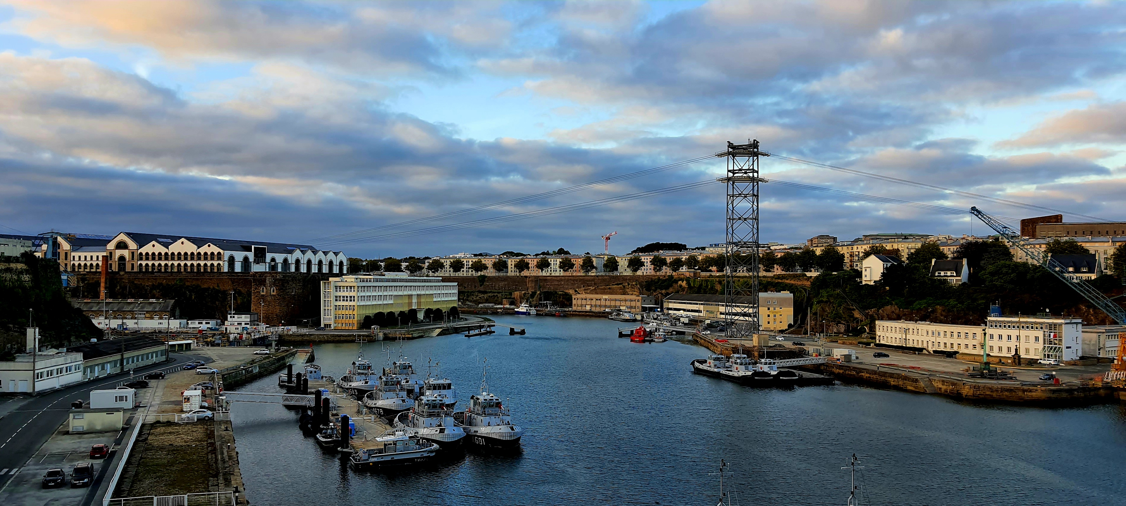 Belle vue sur les chantiers navals et le pont de Recouvrance. Téléphérique toujours en rade à Brest. C'est très dommage.